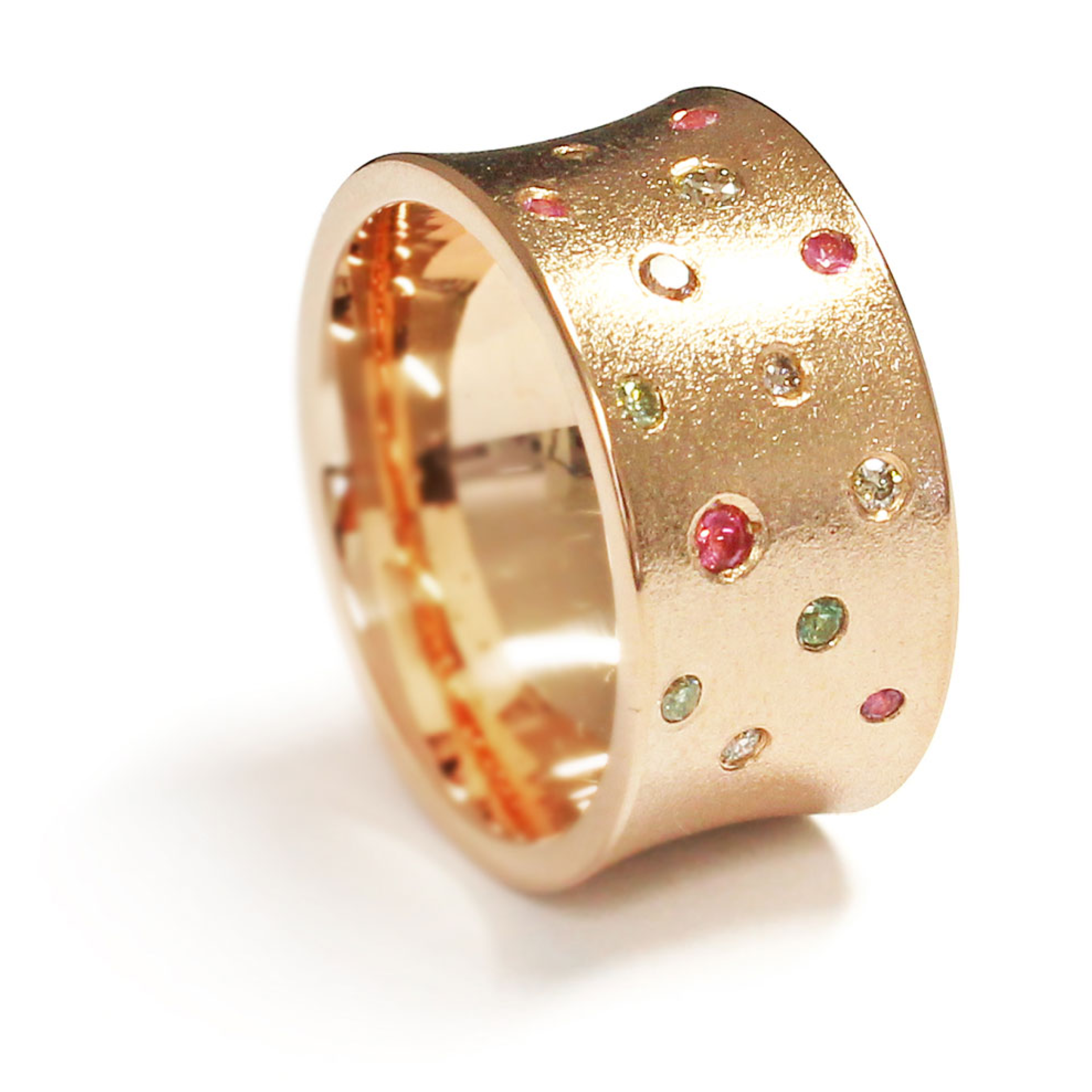 750/ Rotgold mattgeschlagen, Brillanten champagner, Safir pink naturfarben, Safir grün naturfarben
